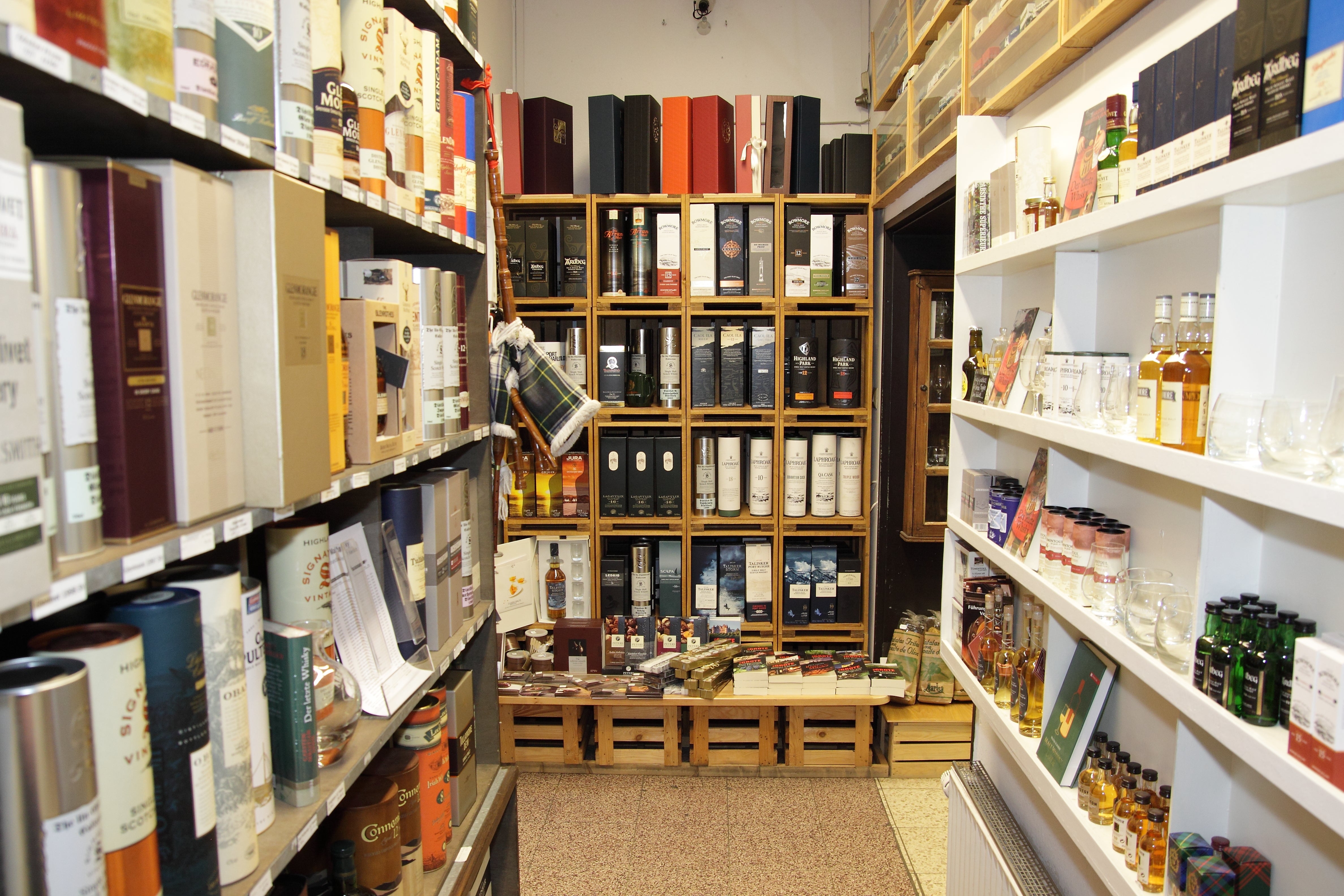Neben den ca. 800 Sorten Wein bieten wir Ihnen eine etwa ebenso große Auswahl an Spirituosen, allein 200 verschiedene Malt Whiskys zieren unsere Regale.